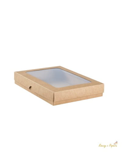 Rozmiar 12,4x17,2x3,5cm, wykonane z papieru typu kraft o gramaturze 300gm2. Pudełko składa się z dwóch części wieczka z okienkiem (w komplecie szybka do samodzielnego podklejenia okienka) i spodu. Obie części są bigowane co ułatwia składanie. Idealnie nadaje się do ręcznie zdobionych kartek okolicznościowych, zaproszeń, podziękowań. Sprawdzi się również jako opakowanie do ręcznie robionej biżuterii itp. Pudełko nadaje się do zdobienia różnymi materiałami: mediami, papierami do scrapbookingu Również bardzo efektownie wygląda pozostawione bez zdobień, ponieważ okienko samo w sobie sprawia niesamowity efekt.