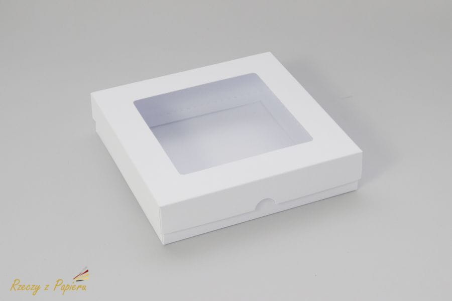 Rozmiar 15x15x3,5cm, wykonane z białego papieru offset, bezdrzewnego o gramaturze 300gm2. Pudełko składa się z dwóch części wieczka z okienkiem (w komplecie szybka do samodzielnego podklejenia okienka) i spodu. Obie części są bigowane co ułatwia składanie. Idealnie nadaje się do ręcznie zdobionych kartek okolicznościowych, zaproszeń, podziękowań. Sprawdzi się również jako opakowanie do ręcznie robionej biżuterii itp. Pudełko nadaje się do zdobienia różnymi materiałami: mediami, papierami do scrapbookingu Również bardzo efektownie wygląda pozostawione bez zdobień, ponieważ okienko samo w sobie sprawia niesamowity efekt.