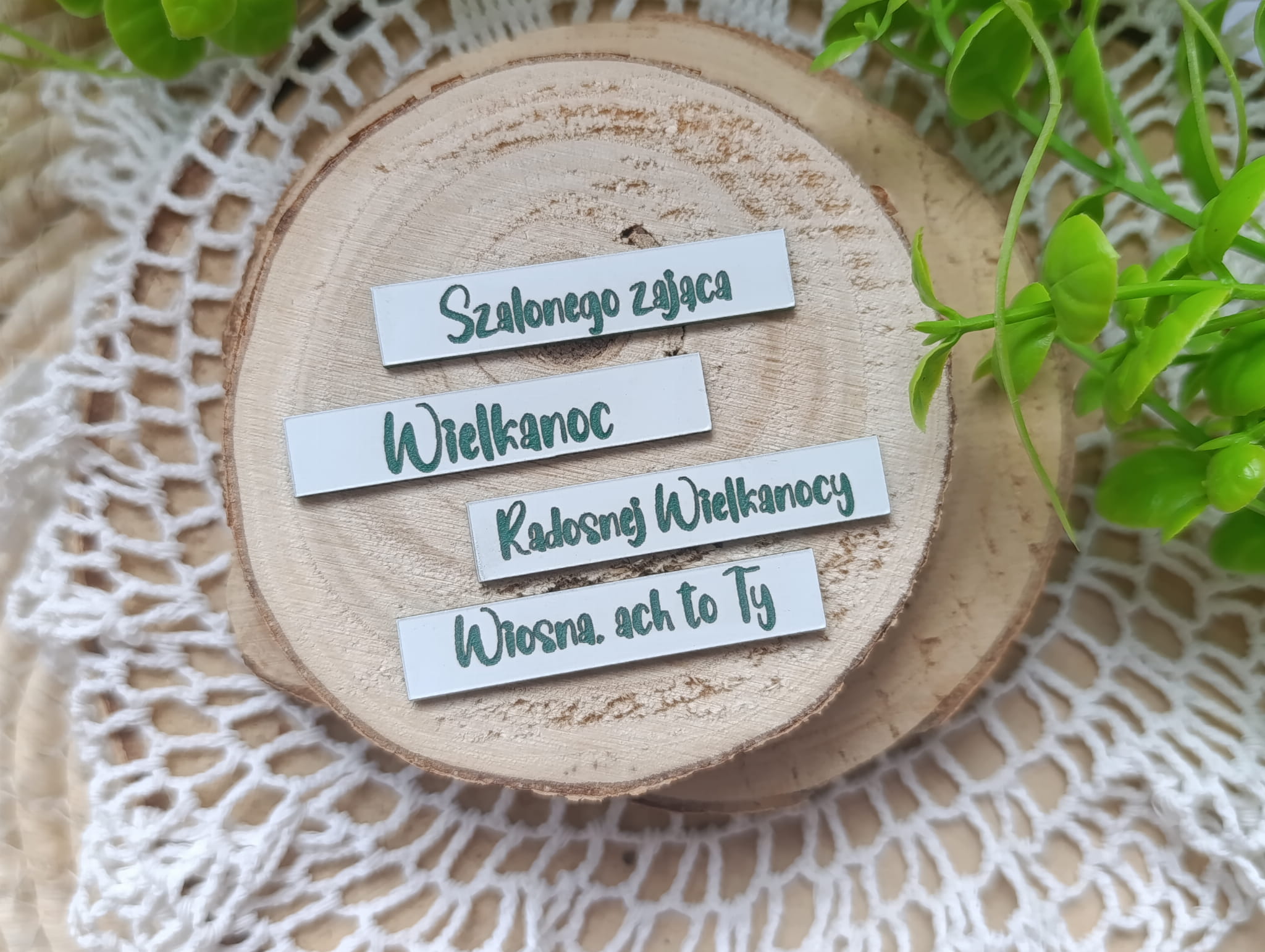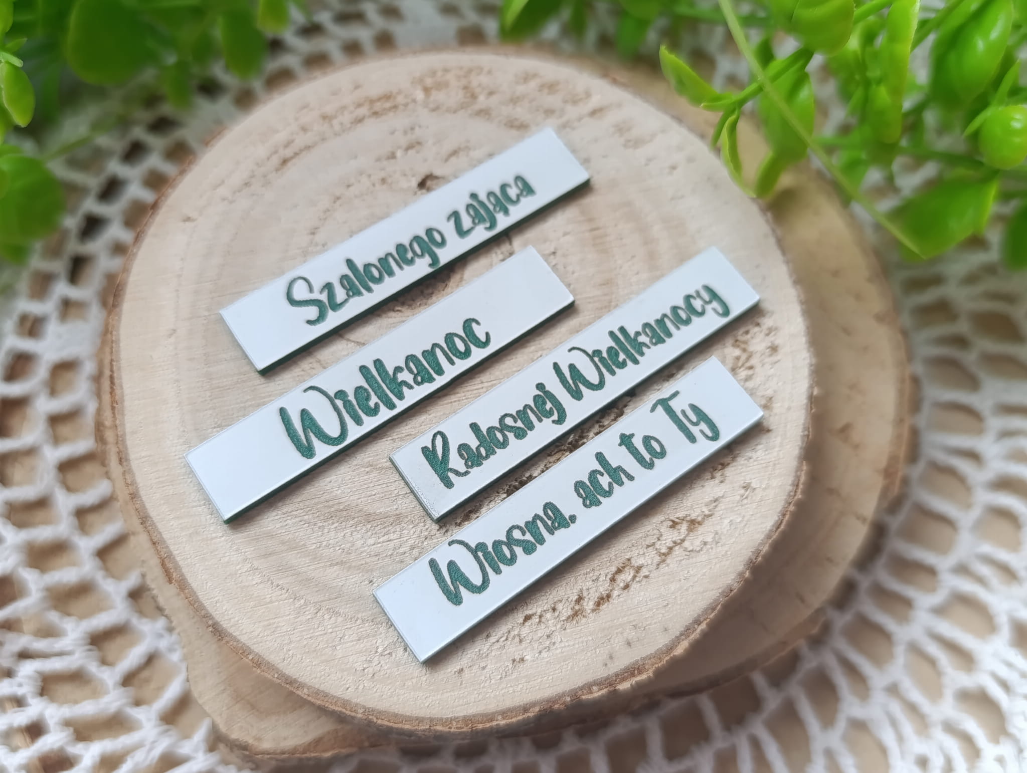 Zestaw 4 napisów z białego laminatu z zielonym grawerem.