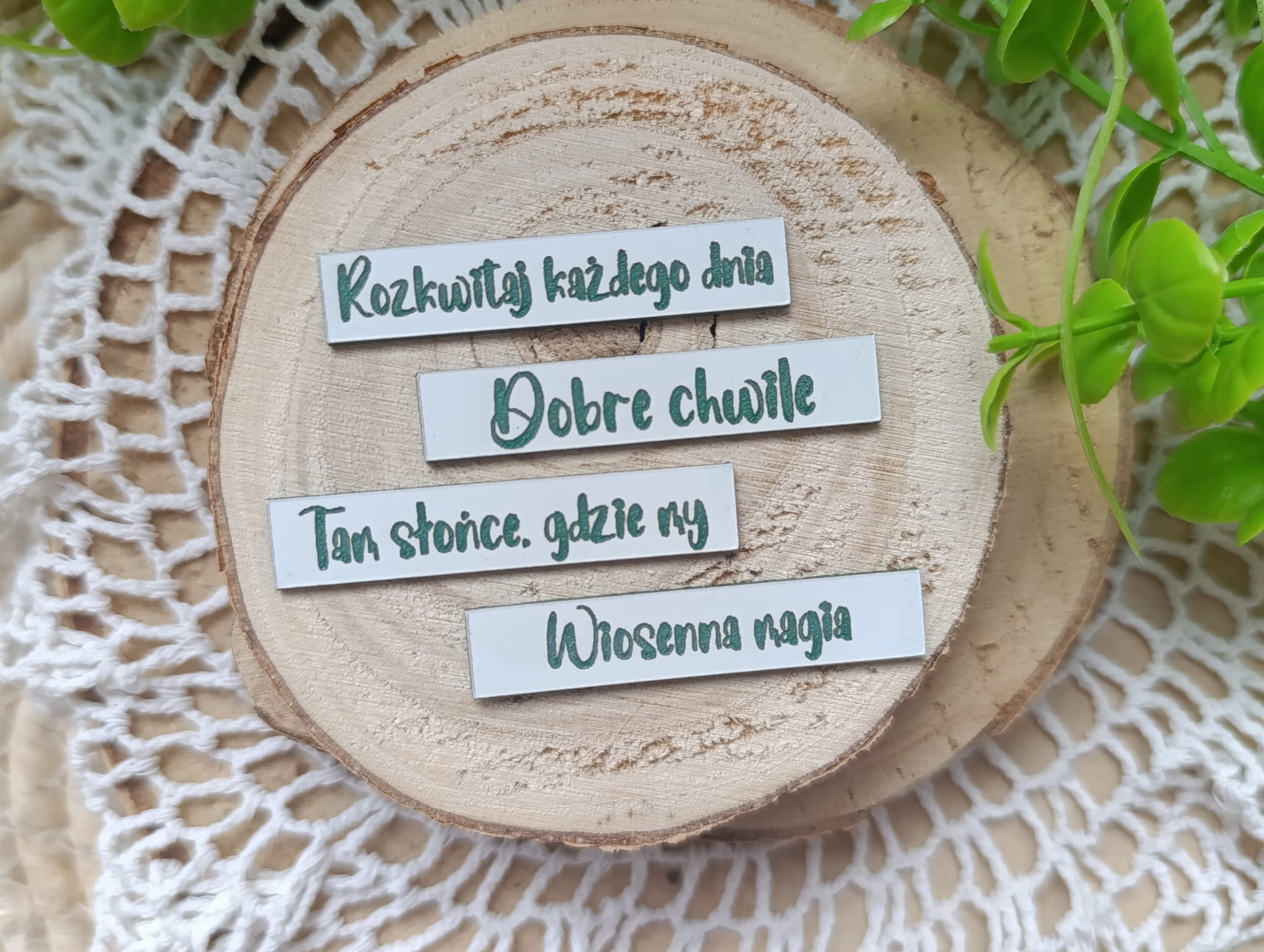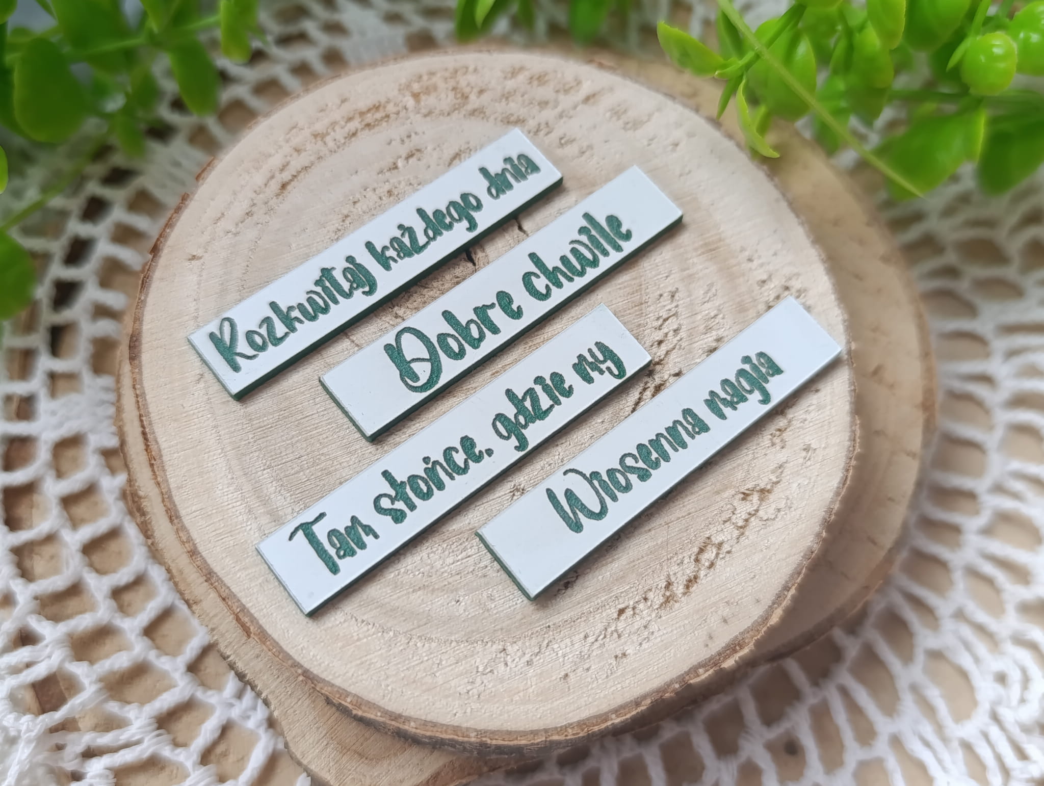 Zestaw 4 napisów z białego laminatu z zielonym grawerem.